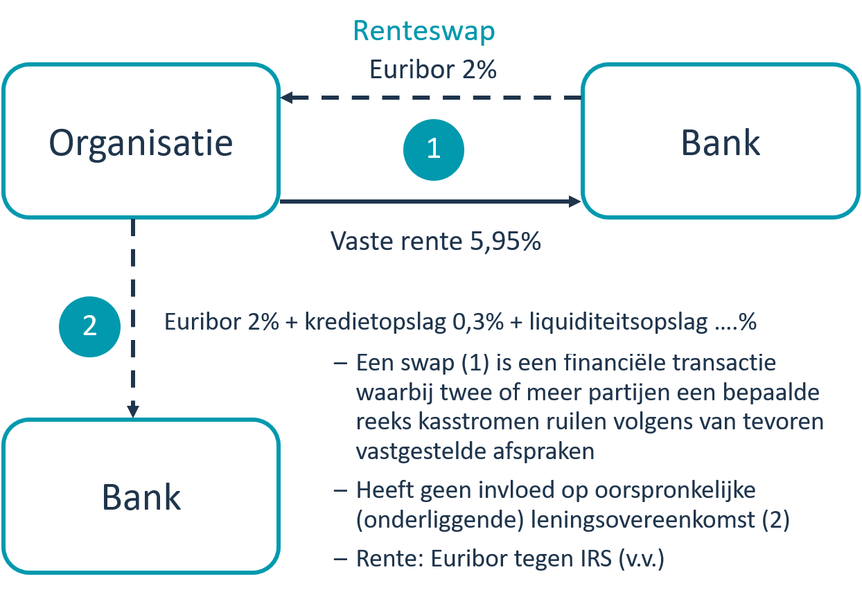 Een renteswap is een overeenkomst tussen de organisatie en de bank over het op termijn (op de ingangsdatum) betalen van een vaste rente aan de bank.